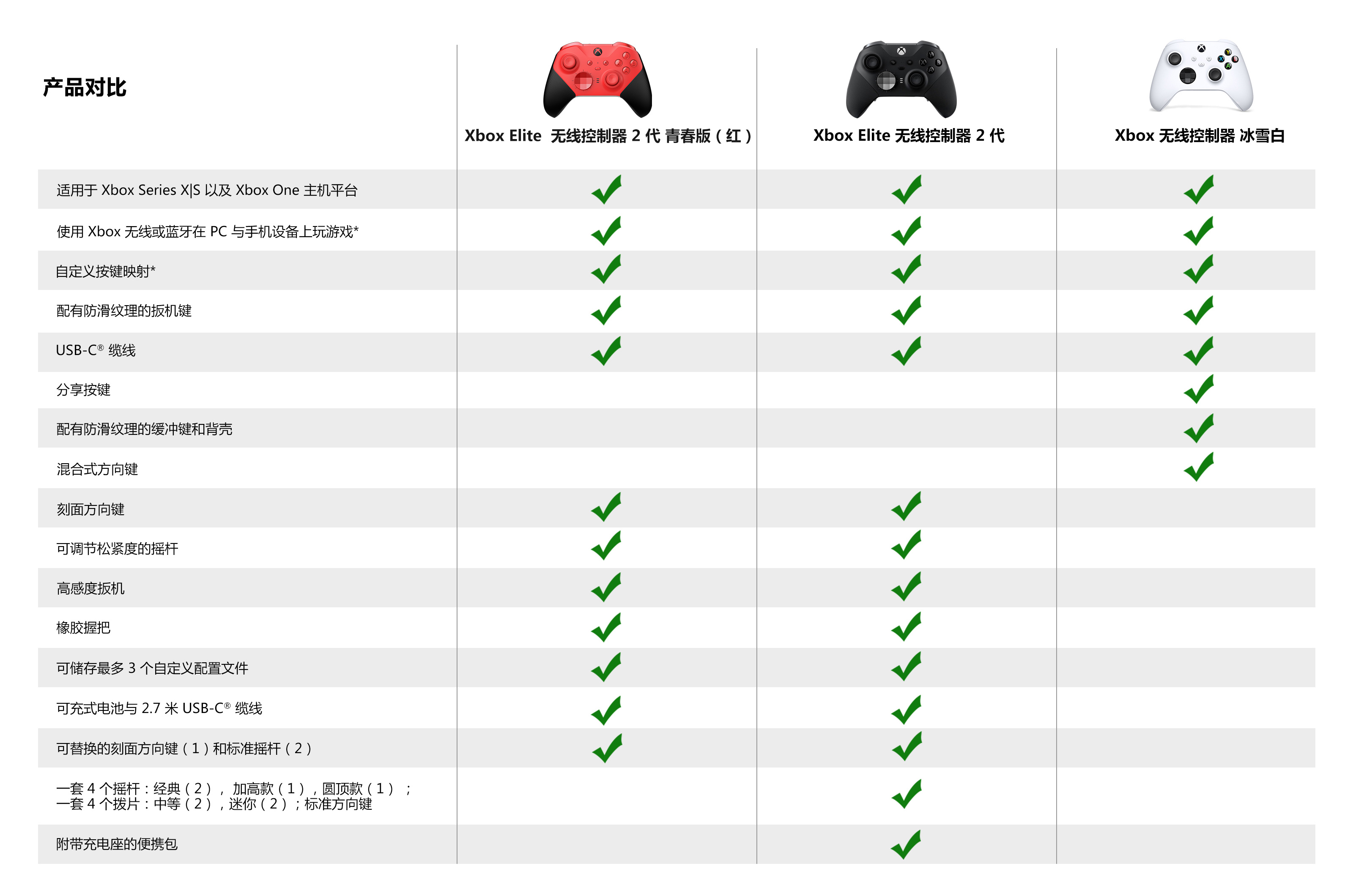 电池使用时间会因其他配件、使用和其他因素而有显著差异。由 Microsoft 使用试生产单元进行的测试。xbox.com/elitebattery。Xbox 附件应用程序功能(包括按键映射和配置文件配置)仅适用于 Xbox Series X|S 、Xbox One 和 Windows 10/11。兼容性取决于设备和操作系统版本。可能需要更新操作系统。前往 xbox.com/xboxone/controller-OS 了解更多资讯。