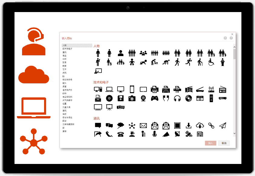 现在 Office 2019 为您提供了包含500个不同类别图标的 SVG 图标库,可以在文档、工作簿、演示文稿和电子邮箱中轻松插入所需图标,之后即可旋转、着色和调整大小,且不会损失任何图像质量。