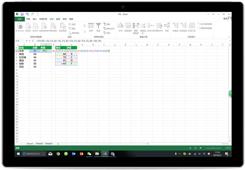 在多条件下,使用IF函数需要多层条件嵌套,让人头昏眼花。现在 Excel 2019 新增的 IFS(加个 S 表示多条件)函数,使用起来变得简单而直观。此外,还新增了文本连接的 Concat 函数和 TextJoin 函数