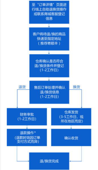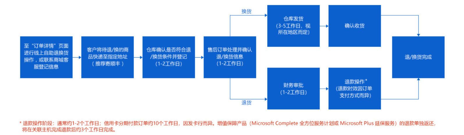 • 客户欲行使退换货之权利的,必须在退换货期限结束前登录微软官方商城,到“订单详情”页面启动线上自助退换货流程。如无法进行自助操作,可点击页面右侧的“联系客服”(手机端见页面右下角“客服”按钮)或致电联络商城客服,提出退换货申请并启动退换货流程。