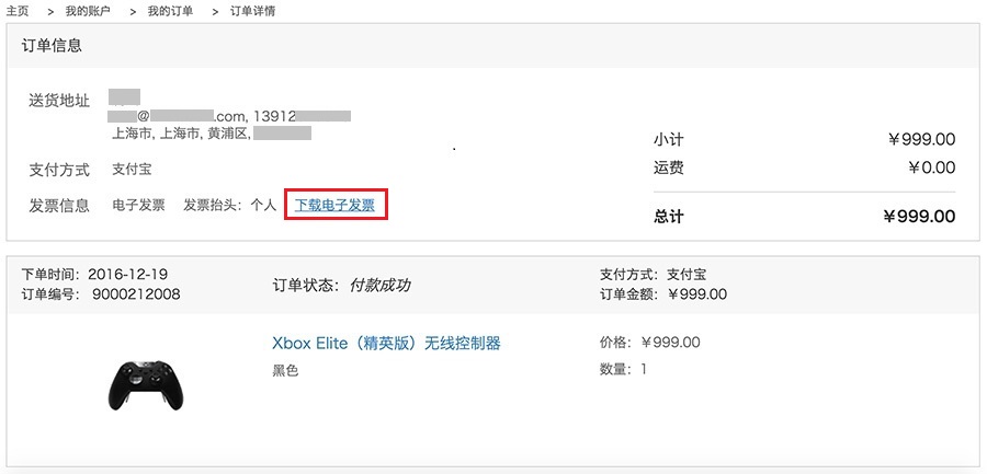 订单完成后,登录“我的账户”, 在“我的订单”—“订单详情”页面即可查看并下载您的电子发票。界面如下图。