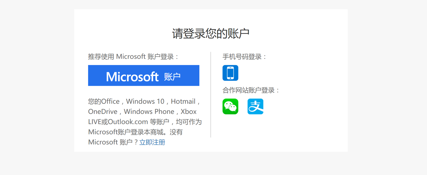 1. 未登录微软官方商城的用户,需首先完成登录。本专区支持多种登录方式(手机端暂不支持微信登录)。