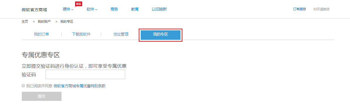 3. 填写您的验证码,阅读并确认同意《微软官方商城专属优惠特别条款》后,点击“提交”。
