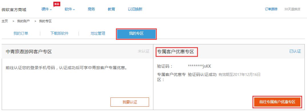 5. 认证状态由“未认证”变为“已认证”,认证成功。点击“前往专属客户优惠专区” 开始享受优惠。